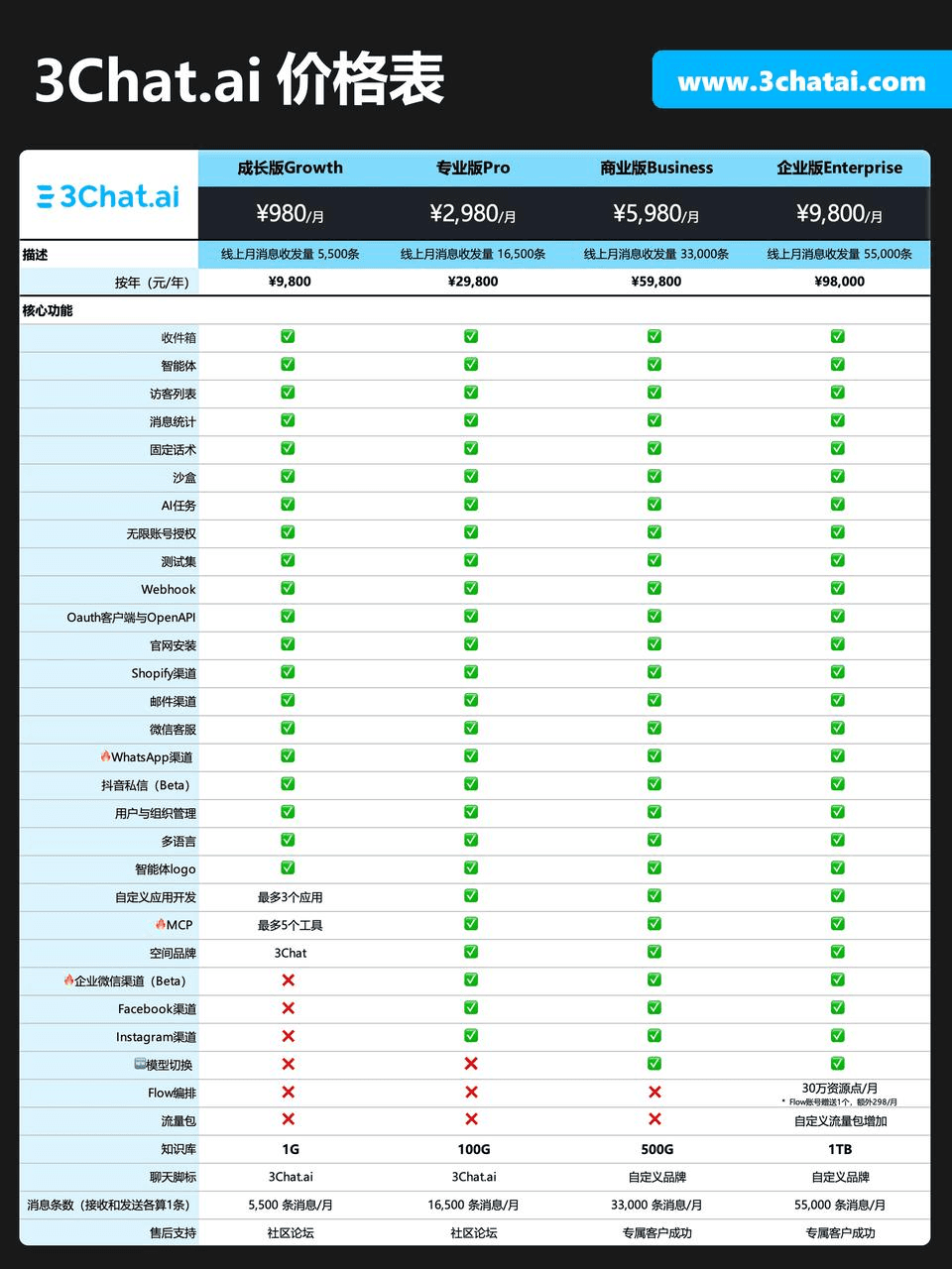 成本类型 | 自建团队 | 客服外包 | 3Chat.ai客服(SaaS) | AI客服(私有化)