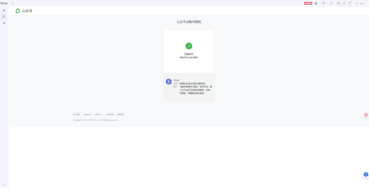 请使用您的安卓或者 iPhone 设备上的微信应用进行扫码,确保您的移动设备已登录微信官方账号,并且是以管理员的身份登录。如果以上信息正确,授权页面会提示扫码成功。