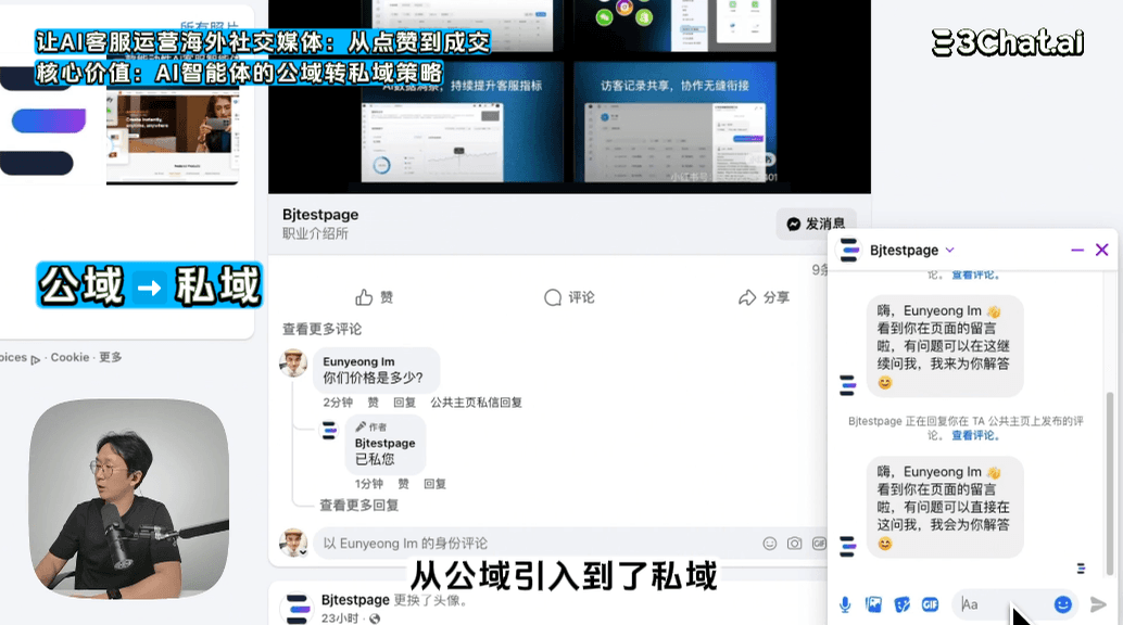 💬 导语:不再错过任何一条Facebook评论在海外社交媒体上,粉丝的每一条评论都代表着潜在的销售线索。如何高效地捕捉这些互动,并将其转化为私域流量进行深度转化,是运营的关键。今天,我们将展示如何利用 3Chat.ai 搭建一套强大的运营智能体,实现对您 Facebook评论的自动监测、公开回复以及私信(DM)打招呼,轻松完成粉丝从公域到私域的存留。